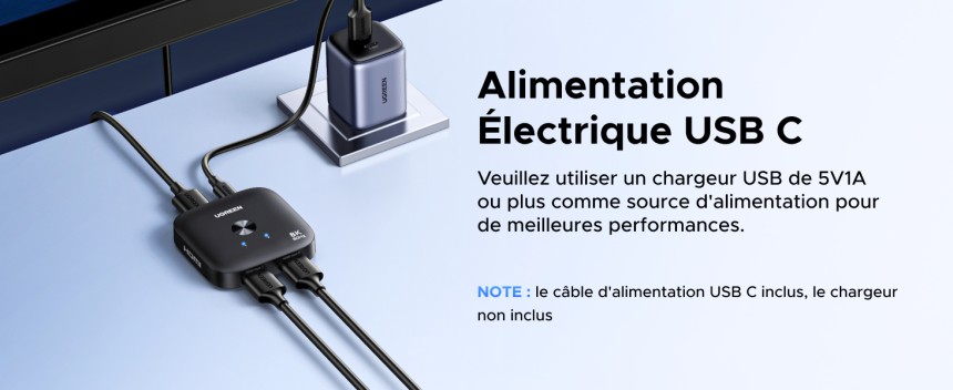 - ▶️ USB-C Alimenté : Ce duplicateur HDMI est équipé d'un port d'alimentation USB-C, il doit être connecté à une alimentation externe (5V/≥1A) pour fonctionner correctement.