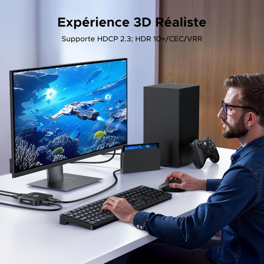 - ▶️ Forte Compatibilité : HDMI switch est compatible avec la plupart des appareils avec port HDMI standard, comme ordinateur portable, PS5, PS4, PS4 Pro, PS4 Slim, Switch, Switch 2, Xbox Series S, Xbox One, Xbox 360, lecteur Blu-ray, TV Stick, Chromecast, TV Box, DVD, HDTV, écran, moniteur, projecteur, Windows, MacOS, Linux, etc.