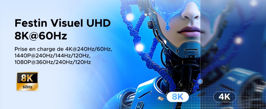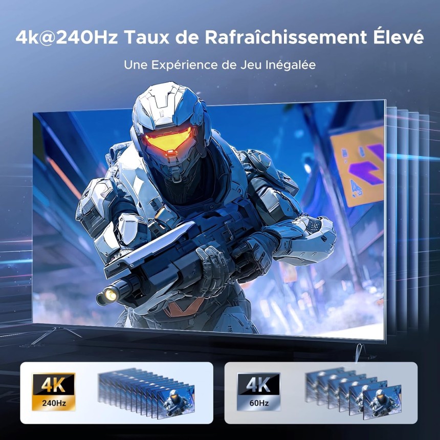 - ▶️ Haute Résolution 8K@60Hz : Ce switch HDMI 2.1 prend en charge jusqu'à 8K@60Hz, le taux de rafraîchissement élevé 4K@240Hz/120Hz et le taux de rafraîchissement variable : VRR/Free-Sync/G-sync. Rétrocompatible avec les résolutions inférieures, vous pouvez choisir la résolution le mieux adaptée à vos besoins et profiter des jeux et de la télévision. Conseil : Pour utiliser la haute résolution et le taux de rafraîchissement élevé, vérifiez que la source et le moniteur le supportent également.