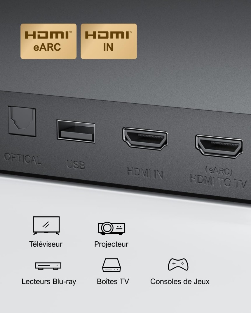 - ▶️ 1 Entrée/1 Sortie 4K HDMI : Rationalisez votre installation grâce à la connectivité HDMI 4K à haut débit et à large bande passante dotée de l'eARC. Passez sans effort d'une console de jeu à un lecteur Blu-ray ou à un téléviseur, tout en profitant d'un son cristallin.