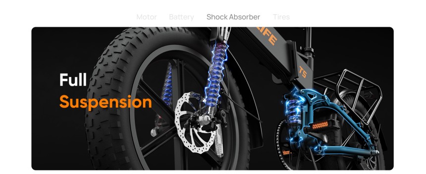 - ▶️ Suspension complète : Le T5 est équipé d'un capteur de couple de 80 Nm, pour garantir une conduite douce et réactive. Les freins à disque mécaniques assurent également une puissance de freinage fiable dans toutes les situations, que ce soit sur route sèche, route mouillée ou terrains accidentés. Cette combinaison de suspension complète et de système de freinage fait du T5 un compagnon parfait pour tous les types de terrains.