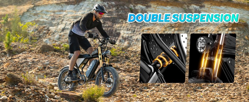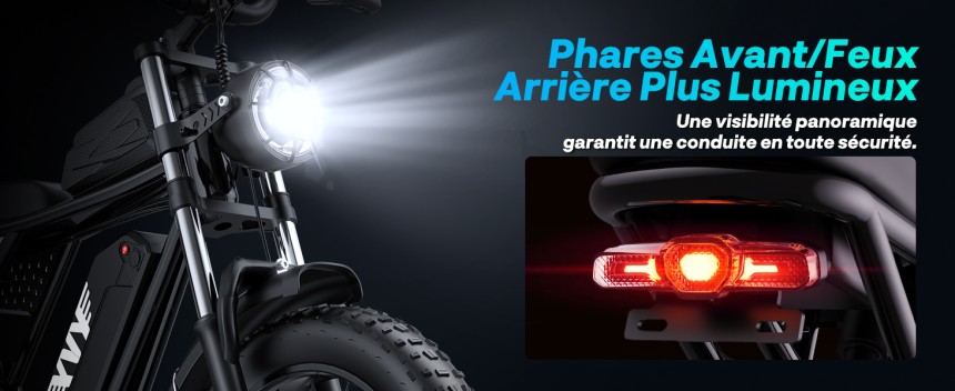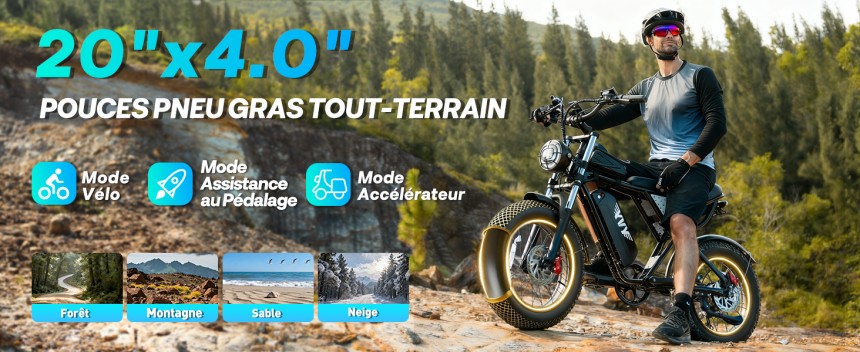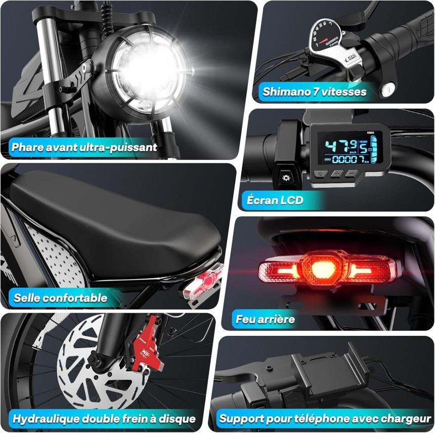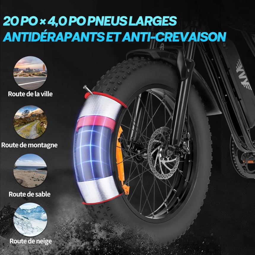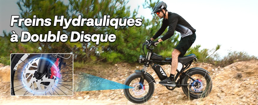- ▶️ Double suspension et freins à double disque hydrauliques : Équipé d'un système de suspension intégrale, de freins à double disque hydrauliques et de pneus larges haute performance de 20" × 4,0 " , ce vélo électrique offre une traction et une stabilité exceptionnelles sur les terrains difficiles, notamment les surfaces mouillées, les sols sablonneux, les sentiers de montagne escarpés et les chemins forestiers. Il allie à la perfection des performances robustes et un confort de conduite optimal. Les phares et feux de freinage à LED garantissent une excellente visibilité lors des sorties nocturnes. L'écran LCD affiche en temps réel le niveau de charge, la vitesse et le kilométrage.