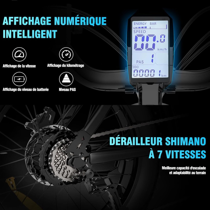- ▶️ 7 vitesses et PAS à 5 niveaux : Ce vélo électrique propose trois modes de conduite (tout électrique, vélo classique et assistance au pédalage) pour répondre à différents besoins en matière de puissance. Le système d'assistance au pédalage dispose de cinq niveaux adaptés à divers scénarios de conduite. Le système d'assistance au pédalage flexible à 5 niveaux vous permet de passer librement d'une conduite détendue (PAS 1) à une ascension puissante (PAS 5). Équipé d'un système professionnel à 7 vitesses, les vitesses basses facilitent les montées, tandis que les vitesses élevées permettent d'atteindre une vitesse maximale sur terrain plat, garantissant ainsi une conduite des plus efficaces.