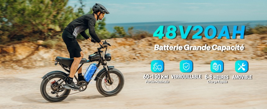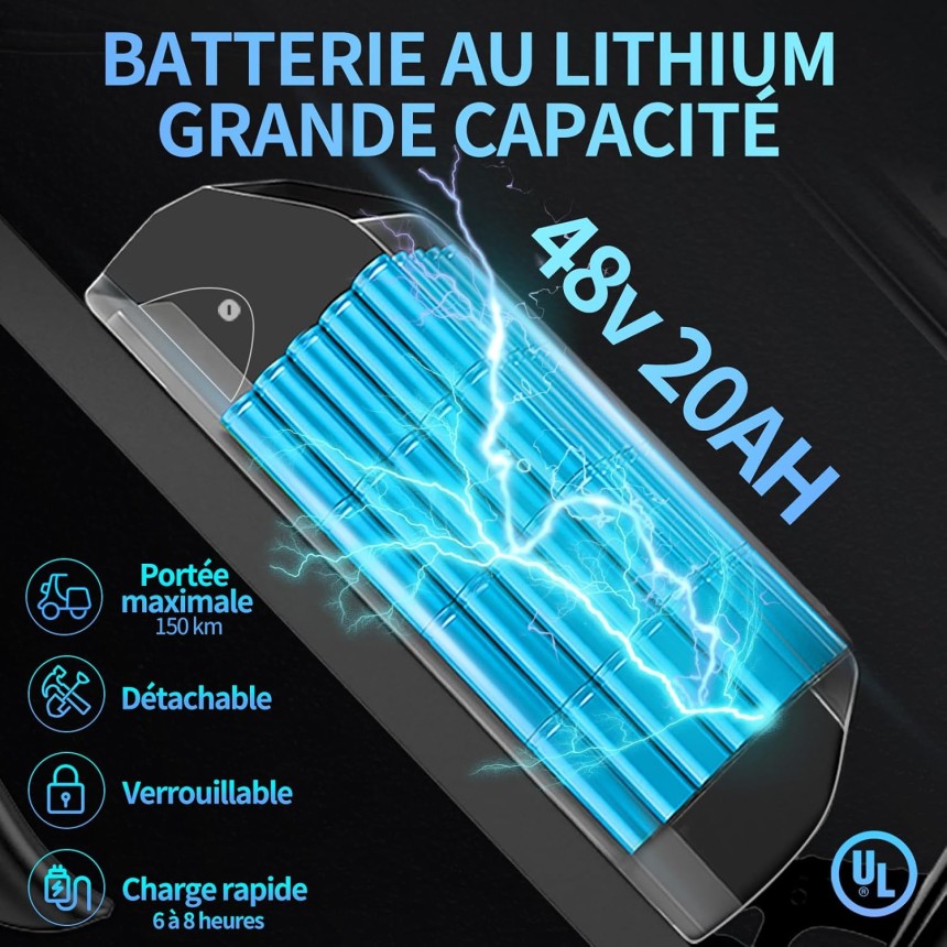 - ▶️ Batteries à longue portée : Équipé d'une batterie haute capacité de 48V et 20Ah, il offre une autonomie prolongée. Toutes les batteries sont certifiées UL et dotées d'un système de gestion de batterie (BMS). Leur conception amovible facilite la recharge, qui ne prend que 6 à 8 heures. En mode tout électrique, l'autonomie atteint 60 à 80 km, et en mode assistance au pédalage, elle peut aller jusqu'à 120 à 150 km (l'autonomie réelle peut varier considérablement en fonction des conditions météorologiques, de la charge, de la vitesse, du terrain, du niveau d'assistance au pédalage et d'autres facteurs).