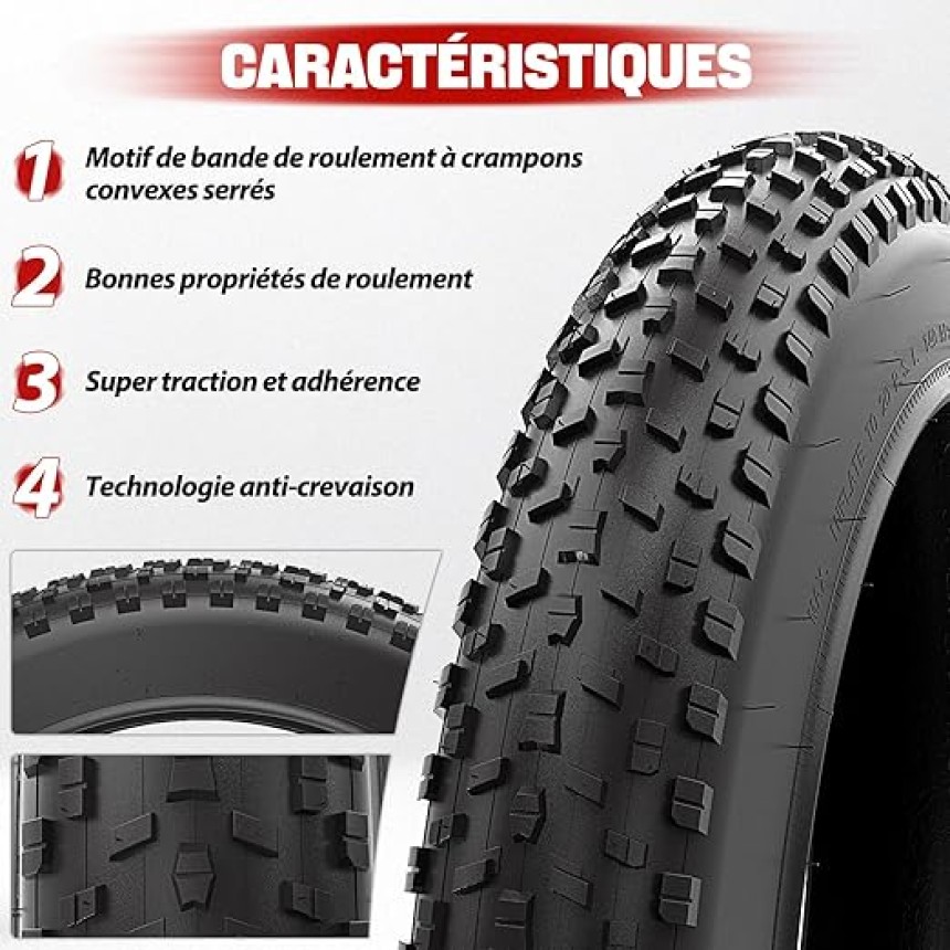 - ▶️ Bande de roulement à crampons étroits et convexes : Offre une excellente adhérence sur tous les types de routes. Le grand volume de pneu offre un meilleur contrôle, des performances de freinage améliorées et une traction sur les surfaces dures.