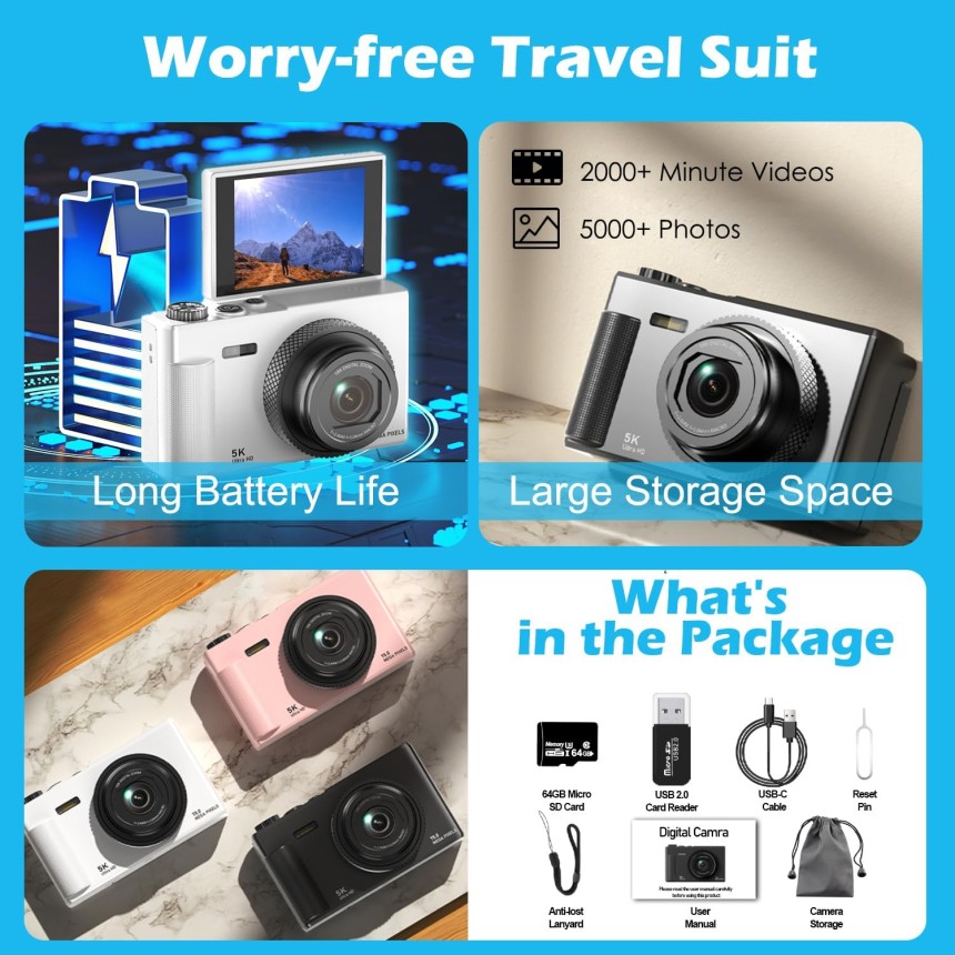 Appareil Photo Numérique, UHD 5K 75MP Digital Camera avec Carte Micro SD 64 Go, Écran Rotatif à 180° de 2,83, Zoom 18X.