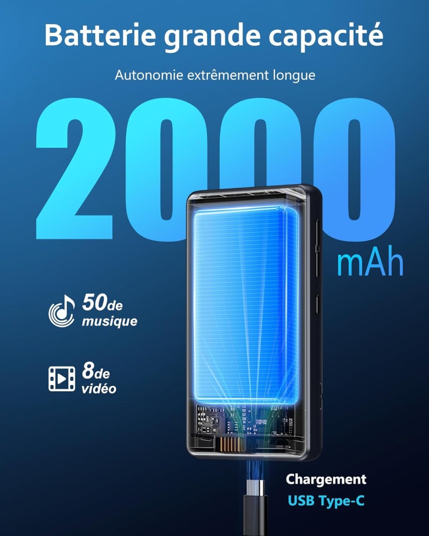 - ▶️ Durée de vie moyenne de la batterie : 3h de charge à 2000mAh + 50h de Musique ou 8h de vidéo avec écouteurs filaires à 50% de volume