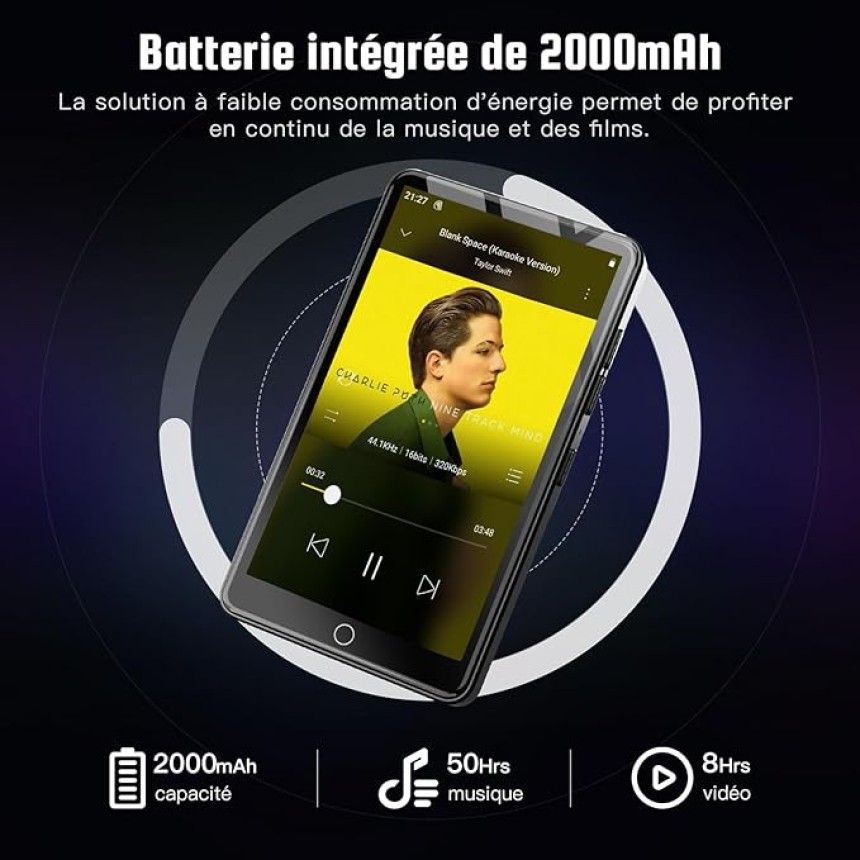 - ▶️ Durée de vie moyenne de la batterie : 3h de charge à 2000mAh + 50h de Musique ou 8h de vidéo avec écouteurs filaires à 50% de volume