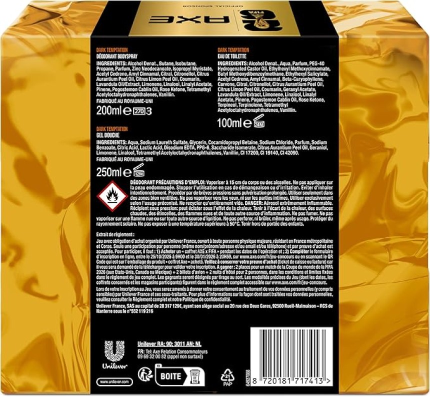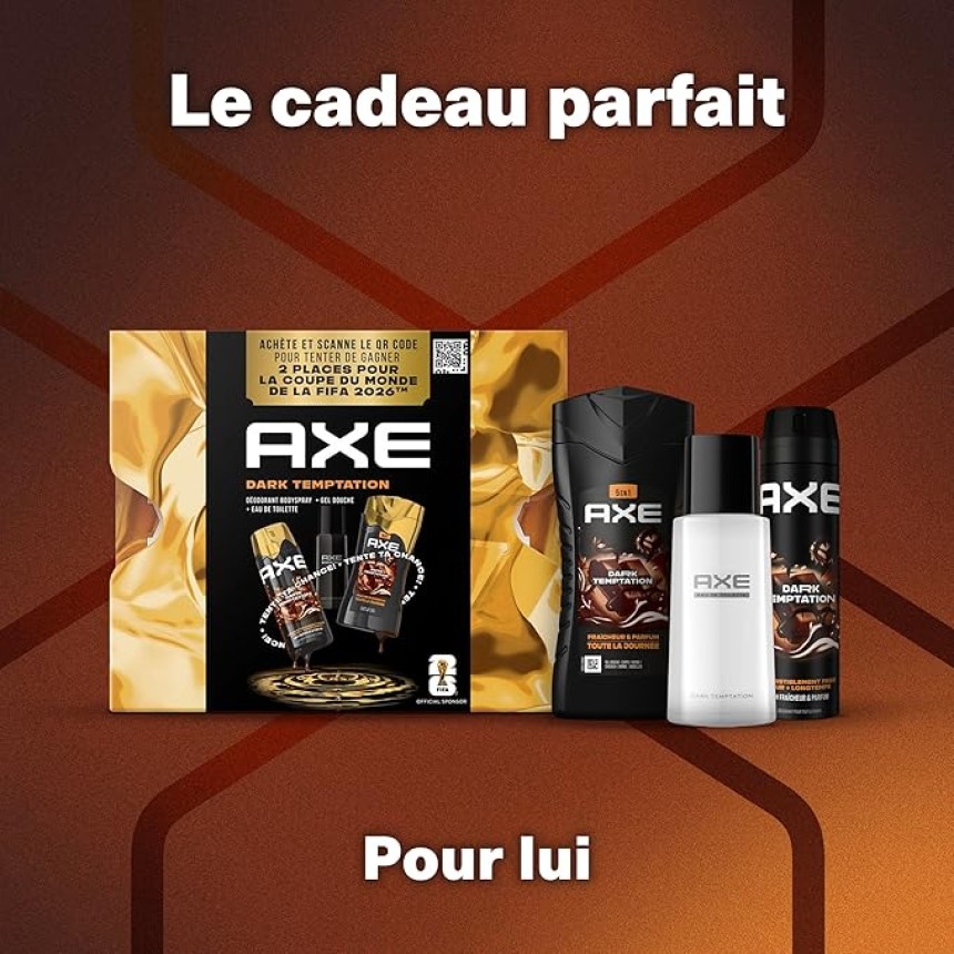 - ▶️ Reste frais et sens irrésistiblement bon avec le coffret AXE Dark Temptation. Ce coffret contient 3 produits homme pour sentir bon toute la journée : un déodorant bodyspray de 200 ml, une eau de toilette de 100 ml et un gel douche 5 en 1 de 250 ml. Un coffret au parfum masculin et frais aux notes de chocolat noir, idéal pour offrir ou se faire plaisir, parfait pour toutes les occasions. Le déodorant homme bodyspray de 200 ml apporte une protection contre les odeurs et libère un parfum ultra-frais pendant 48 h.