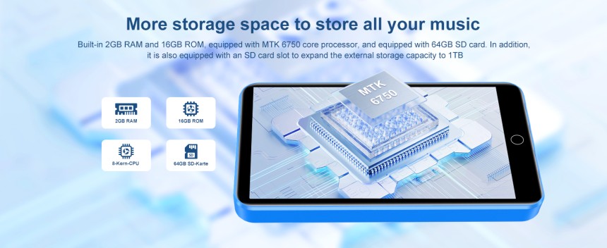 - ▶️ Stockage extensible jusqu’à 1TB : disponible en versions 2GB, 16GB et 64GB, pour stocker facilement musique, vidéos, photos et autres fichiers. Le slot pour carte mémoire en bas permet d’étendre la mémoire jusqu’à 1TB.