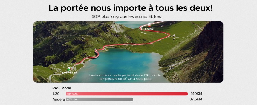 ▶️ Le ENGWE L20 est un vélo électrique qui respecte pleinement le code de la route européenne. La puissante batterie 48V 13Ah et le moteur sans balais de 250W de l'Ebike permettent d'atteindre des vitesses allant jusqu'à 25 km/h. L'autonomie du booster peut aller jusqu'à 126 km. Le vélo électrique ENGWE L20 n'a pas de levier d'accélération. Si vous avez besoin d'accélérer, il vous suffit d'appuyer sur le bouton pour accélérer.