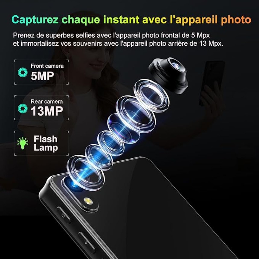 - ▶️ Appareil photo arrière de 13 MégaPixels et ampoule flash