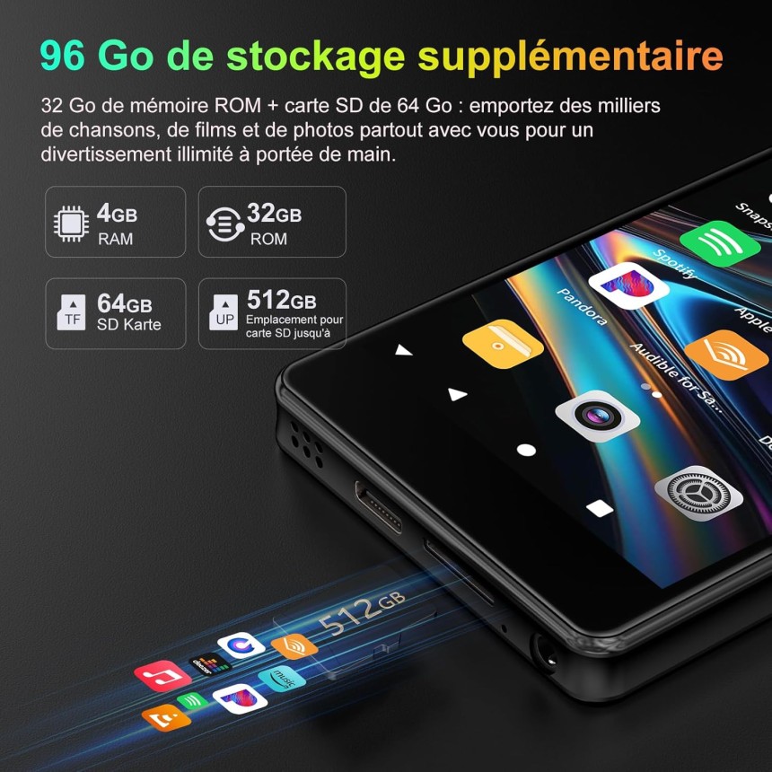 96 Go + écran 4,02 Pouces + batterie : 20h de Musique ou 6h de vidéo