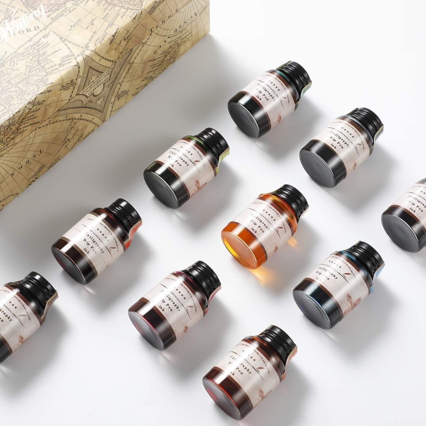 - ▶️ Encre de couleurs assorties : L'ensemble d'encres de calligraphie comprend 10 couleurs assorties (noir, bleu, rouge, vert, violet, orange, marron, rose, bordeaux, turquoise) et chaque couleur est contenue dans une bouteille d'encre de 20 ml. Par conséquent, vous avez la liberté de choisir entre différentes couleurs pour différents styles d'écriture, de dessin et de journalisation.