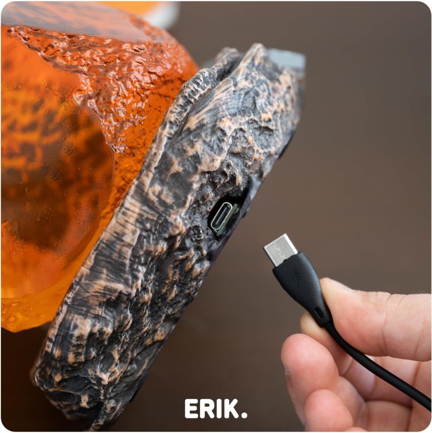 - ▶️ Fonctionnement : Elle s'allume grâce à un câble USB de type C (inclus) et projette une lumière chaude et orangée. Elle fonctionne aussi avec 2 piles AAA de 1,5V (non incluses). Pour l'allumer, utilisez son bouton ON/OFF.