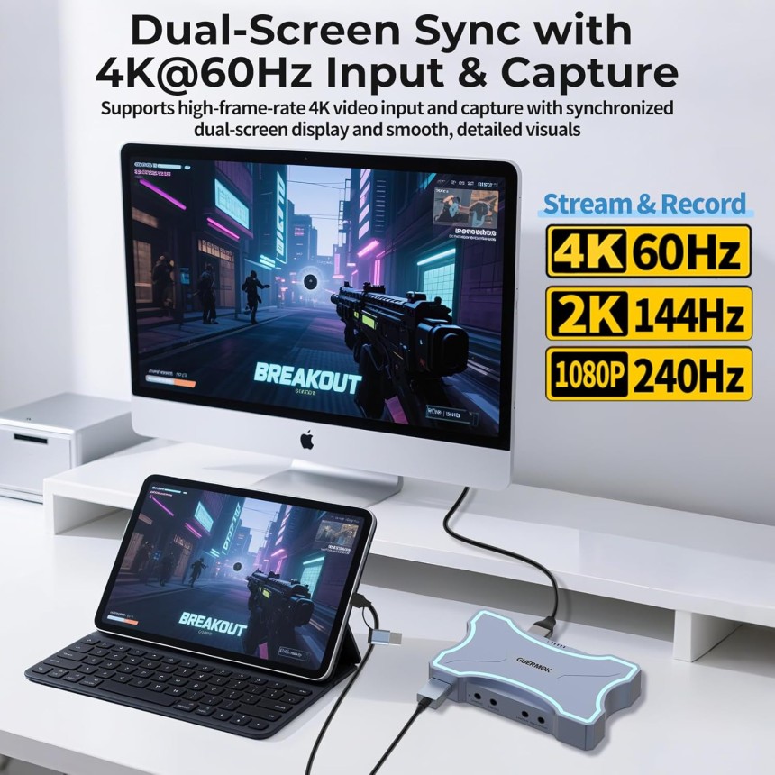 Guermok 4K HDMI Capture Card - Dual HDMI in/Loop-Out - USB 3.0 - 4K@60Hz / 2K@144Hz Video Capture - Mic/Line in - 4K60 Passthrough - Streaming and Gaming for Switch 2/1.