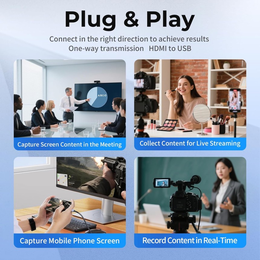 - ▶️ Sortie HDMI en boucle 4K@60Hz en temps réel : Le port HDMI loop-out prend en charge jusqu’à 4K@60Hz, permettant une sortie vidéo en temps réel vers un écran externe ou un moniteur portable avec une latence quasi nulle—idéal pour le streaming en direct, le jeu et l’aperçu sur double écran.Supports EDID, Max output resolution: 4096 x 2160@60Hz YUV420, 4096 x 2160@30Hz YUV444. Utilisez un port USB 3.0 ou supérieur (USB 2.0 limité à 1080P). Si vous êtes toujours en 1080P malgré l’USB 3.0, tournez le connecteur USB-C de la carte de capture à 180° et reconnectez-le.