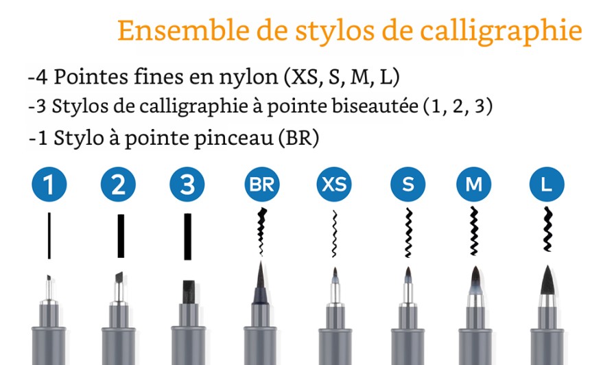 - ▶️ 8 STYLOS AVEC DIFFÉRENTES CONSEILS : Les stylos de calligraphie ont 8 pointes de taille (0,5 mm, 1 mm, 2 mm, 3 mm, extra-fin, fin, moyen, pinceau, pinceau doux), contient à la fois le jeu de calligraphie noir à pointe souple et dure pour la main des débutants caractères.