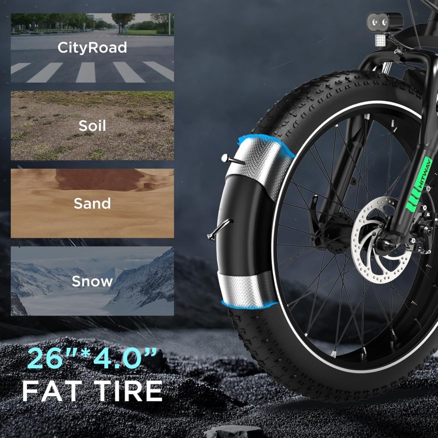 - ▶️ Conçu pour les Terrains Extrêmes - Ses pneus fat tire de 26" x 4.0" résistants aux crevaisons et antidérapants assurent une stabilité et une adhérence exceptionnelles, même sur les sentiers rocailleux ou les chemins boueux.
