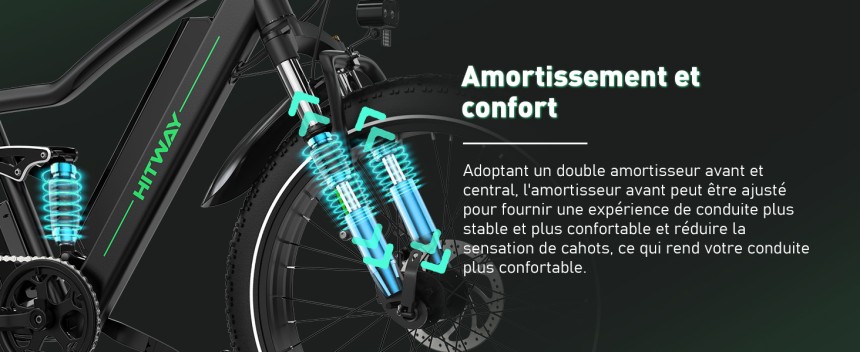 - ▶️ Confort Optimal Grâce à la Double Suspension - La suspension avant réglable et l'amortisseur central absorbent les chocs et les vibrations, offrant une conduite fluide et confortable, même sur les terrains accidentés.