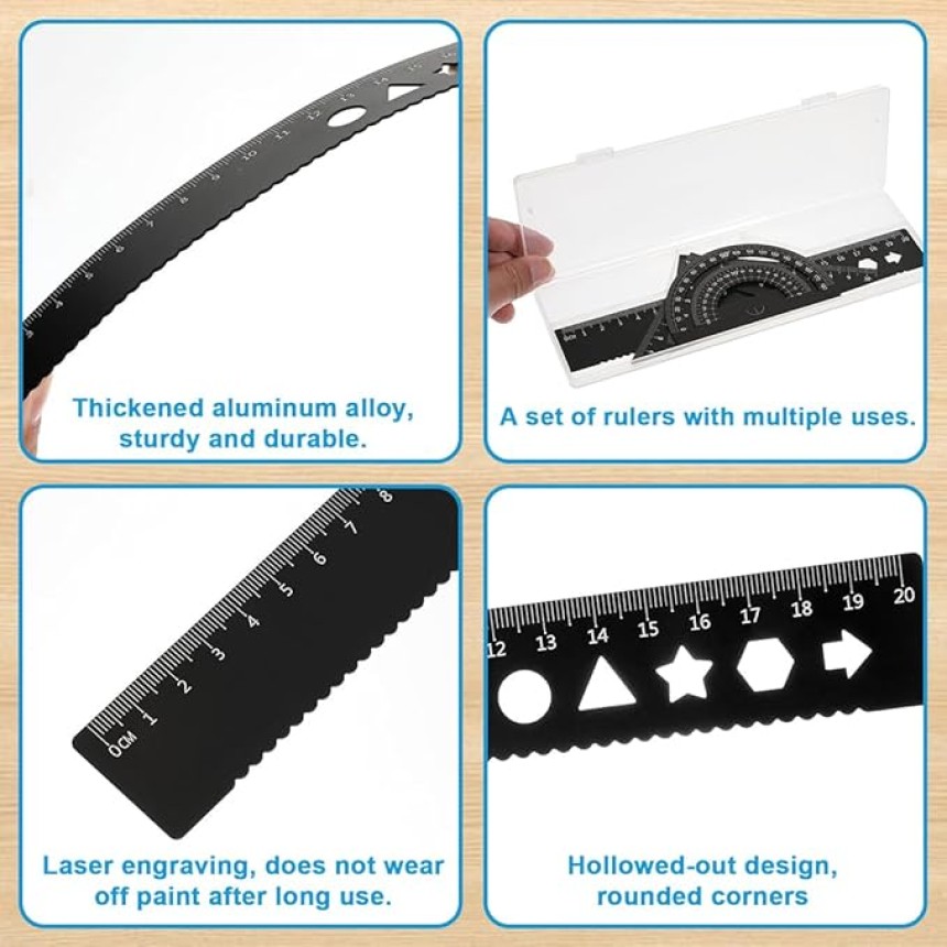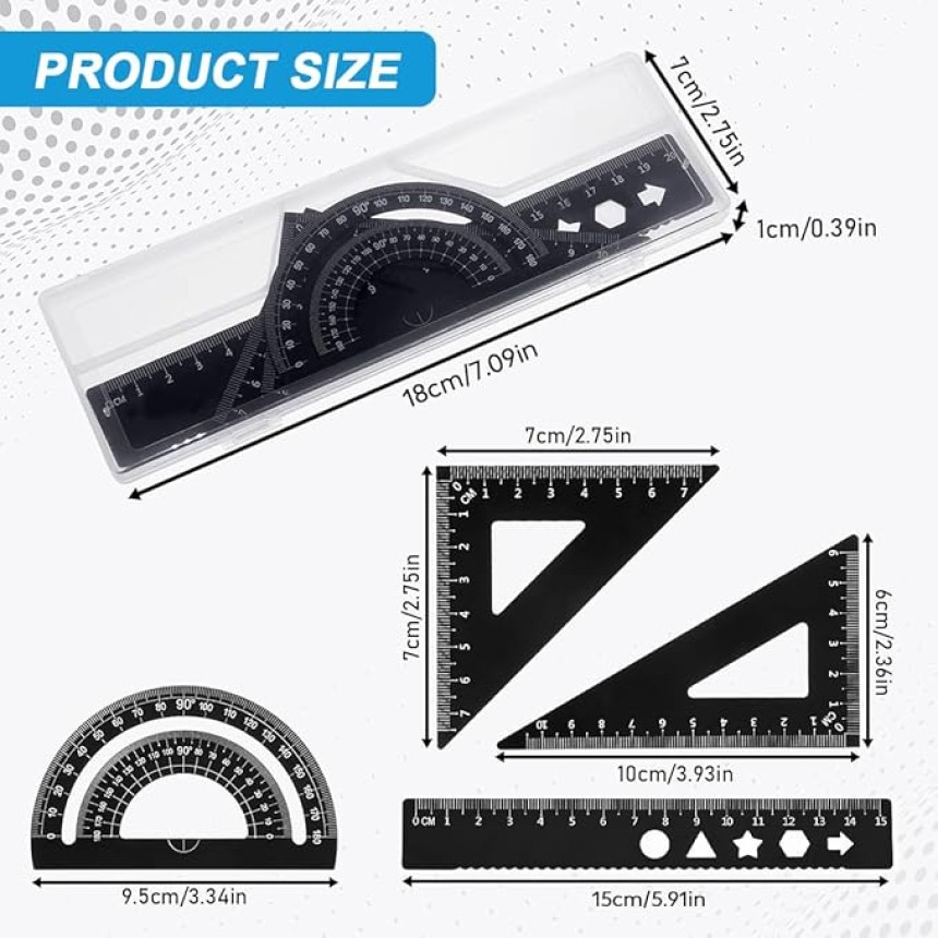 - ▶️ Contenu de l'emballage : ensemble de 4 pièces, comprenant 1 règle, 2 triangles, 1 rapporteur, une boîte transparente robuste et réutilisable pour un rangement et un transport faciles, vous permettant de stocker et de transporter l'ensemble en toute sécurité et proprement.