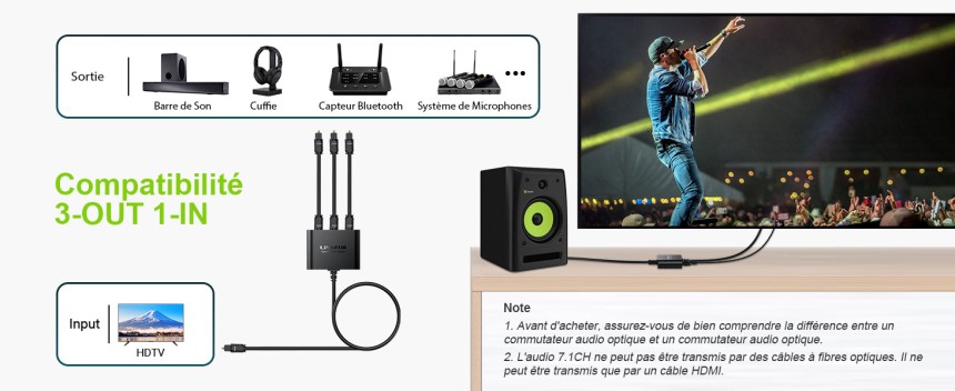 - ▶️ Forte Compatibilité : Le séparateur audio numérique est compatible avec les lecteurs PS3 / STB / Xbox / VCR / Blu-ray / HDTV / Amplificateur DVD
