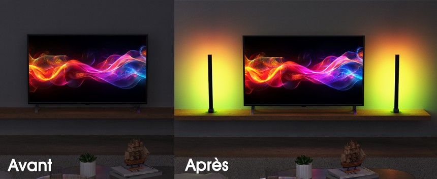 - ▶️ Les bandes lumineuses Smart Ambient présentent un arc-en-ciel d'effets qui vous offrent une expérience visuelle époustouflante : la couleur et le mode des bandes lumineuses dansent avec la musique et créent une atmosphère de fête amusante et détendue