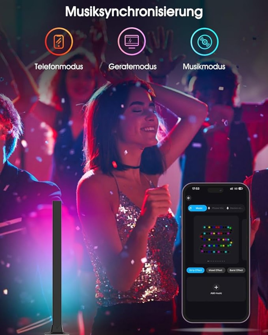 - ▶️ Fonction de rythme et de synchronisation : Options de 3 modes de rythme intégrées : mode musique, microphone de téléphone portable. Microphone de l'appareil (selon la configuration de l'appareil). La bande lumineuse changera avec le rythme de la musique, ou le microphone capturera le son externe