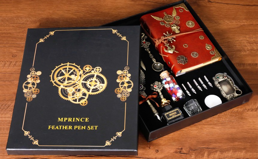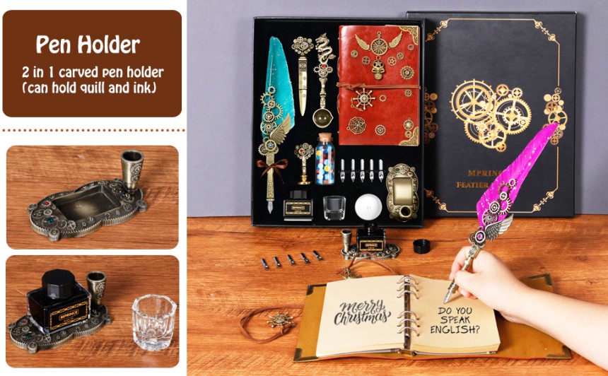 - ▶️ Le kit d'encre Quill Pen comprend : 1 stylo de calligraphie à plumes, 1 carnet, 1 encre (noir), 5 pointes de stylo en acier inoxydable de différentes tailles, 1 2 dans un porte-stylo sculpté (peut contenir une plume et de l'encre), 1 perle de cire de couleur, 1 bougie blanche, 1 tampon « horloge à engrenage », 1 cuillère à cire à fondre, 1 enveloppe, 1 papier à lettre, 1 tasse (tasse Vous pouvez utiliser le ressort avec Nettoyer à l'eau ou verser l'encre dans l'encre Dip pour écrire), 1 outil d'enveloppe ouverte, 1 coffret cadeau exquis