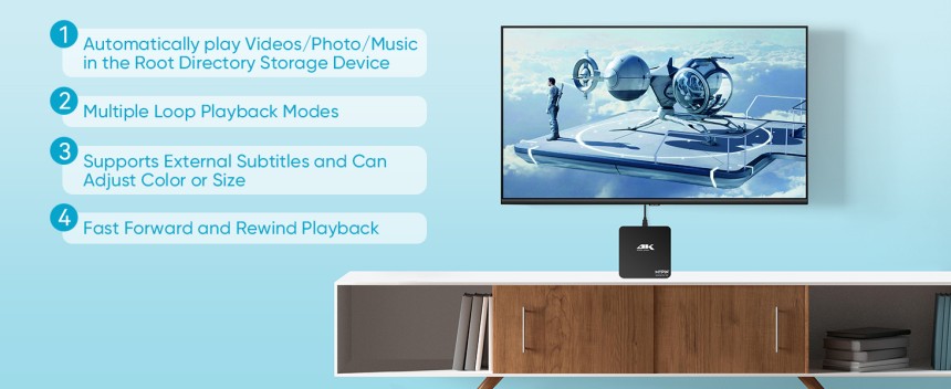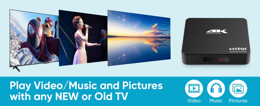 - ▶️ Prise en charge de la lecture vidéo/image/musique/PPT et mode automatique/boucle : Ce 4k lecteur multimédia pour TV peut lire diverses vidéos, musiques et photos populaires. Il a une lecture répétée, une lecture automatique et un mode de lecture aléatoire ; Il lit également le document PPT. Vous pouvez choisir une variété de modes de jeu : simple, séquentiel. Surtout pour la lecture aléatoire de vidéos, de musique et d'images.