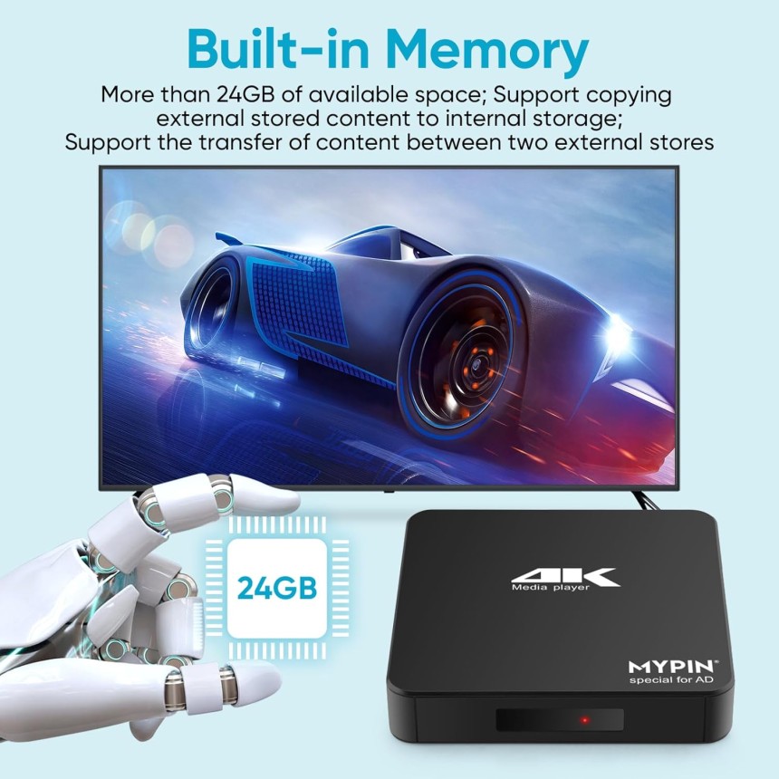 - ▶️ Compatibilité puissante : media player 4k peut lire à partir d'une carte micro SD, d'un lecteur flash USB jusqu'à 256 Go et d'un disque dur jusqu'à 8 To; y compris FAT32, exFAT et NTFS.; L'appareil dispose d'une mémoire 11G intégrée, qui peut stocker vos films ou photos préférés. Deux ports USB pour connecter deux appareils, prise en charge de la souris et du clavier, vous pouvez contrôler à distance avec la souris.