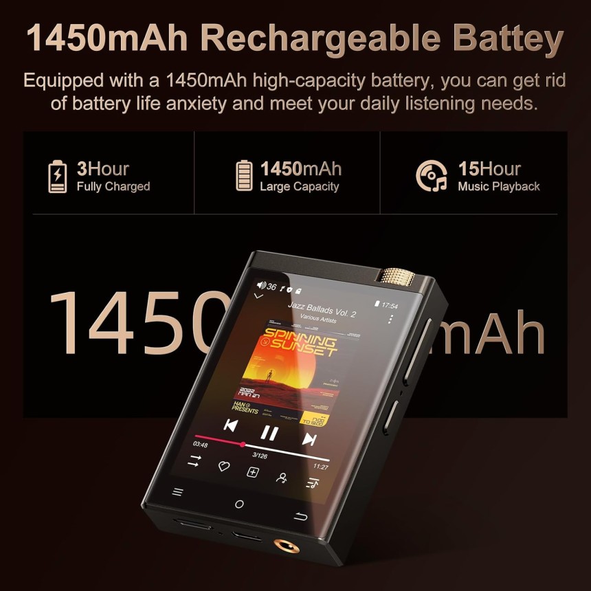 - ▶️ Durée de vie moyenne de la batterie : 3h de charge à 1450mAh + 15h de Musique avec écouteurs filaires à 50% de volume