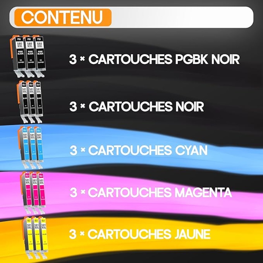 - ▶️ Multipack: 3x Noir pigmentaire (PGBK) (chaque 26ml), 3x Noir BK (chaque 12ml), 3x Cyan (chaque 12ml), 3x Magenta (chaque 12ml), 3x Jaune (chaque 12ml)