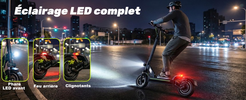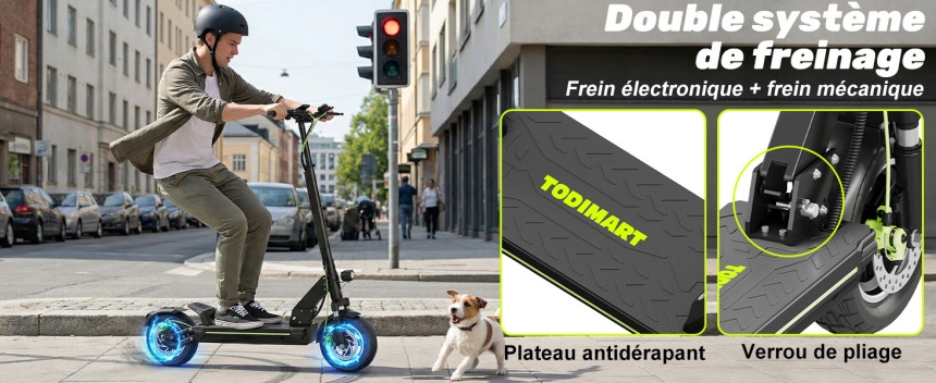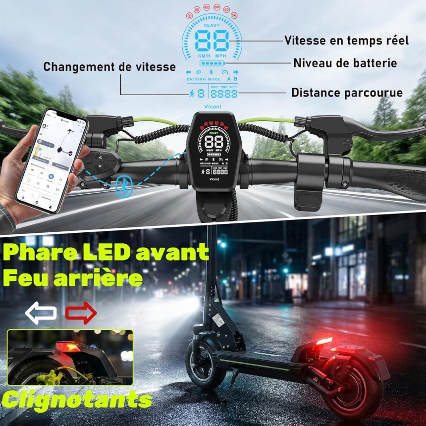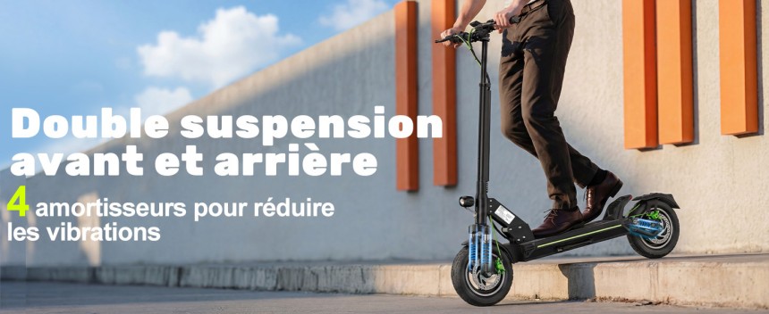 - ▶️ Trottinette electrique adulte tout terrain : Équipée de pneus gonflables tout-terrain de 10 pouces, cette trottinette électrique adultes s’adapte aussi bien aux routes asphaltées qu’aux chemins en terre ou irréguliers.Le système de freinage double (frein électronique + frein mécanique), les poignées et le deck antidérapants, ainsi que l’indice d’étanchéité IP55, garantissent une conduite sûre.Phare avant puissant, feu arrière clignotant et clignotants gauche/droite améliorent la visibilité nocturne. Les suspensions avant et arrière à double ressort assurent un excellent confort de conduite.