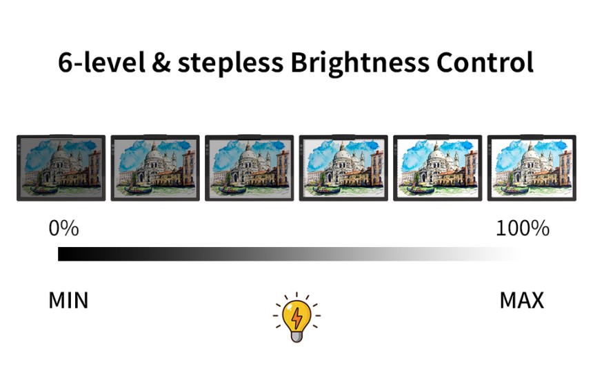 - ▶️ Luminosité réglable en continu et 6 niveaux : Contrôle de la luminosité en continu de 0 à 100 % pour répondre à vos différents besoins. En appuyant brièvement pour choisir 6 niveaux de luminosité ou en appuyant longuement pour l'adapter à vos œuvres dans différents environnements. Avec une température de couleur de 3 000 à 6 500 K, il est suffisamment lumineux pour éclairer uniformément plusieurs couches de papier sans éblouissement. Ne vous fatiguez plus les yeux pendant le traçage de votre dessin.