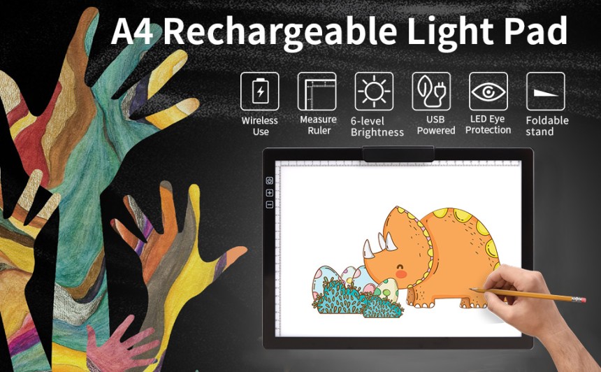 - ▶️ Contrôle de la luminosité à 6 niveaux et en continu---Le traceur lumineux A4 est conçu avec 6 modes de luminosité uniformes, appuyez doucement sur la touche de fonction pour ajuster la luminosité en fonction de votre confort et de vos besoins. Il suffit d'appuyer longuement sur la touche de fonction pour régler la luminosité en continu.