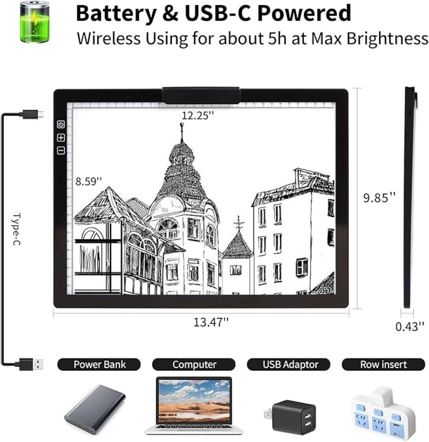 - ▶️ Alimenté par batterie et alimenté par USB avec port de type C : Ce traceur de boîte lumineuse A4 vous permet de profiter de la commodité de l'utiliser à tout moment et en tout lieu grâce à la batterie intégrée. Fonctionne pendant environ 5 heures après une charge de 1,5 heure (complètement chargée) à la fois. Le mode batterie et le mode de charge sont applicables.