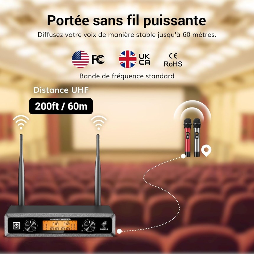 TW820 2 Microphone à main - sans fil UHF sans fil professionnel dynamique - 60 mètre - double système de microphone à main kit KTV pour karaoké, fête, DJ, église, mariage, réunion.