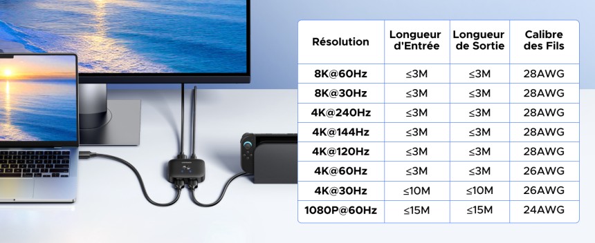 - ▶️ Haute Résolution 8K@60Hz : Ce switch HDMI 2.1 prend en charge jusqu'à 8K@60Hz, le taux de rafraîchissement élevé 4K@240Hz/120Hz et le taux de rafraîchissement variable : VRR/Free-Sync/G-sync. Rétrocompatible avec les résolutions inférieures, vous pouvez choisir la résolution le mieux adaptée à vos besoins et profiter des jeux et de la télévision. Conseil : Pour utiliser la haute résolution et le taux de rafraîchissement élevé, vérifiez que la source et le moniteur le supportent également.