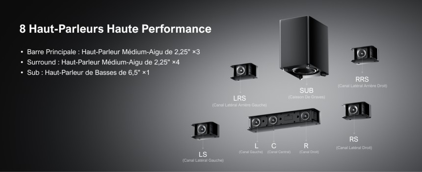 Barre de Son TV + 7.1ch + Puissance : 460W RMS