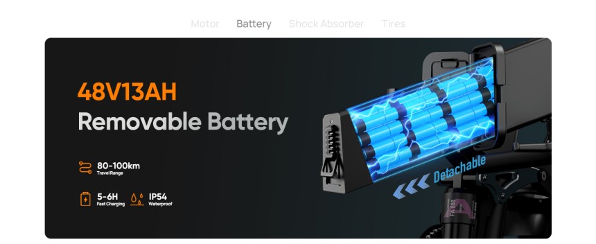 - ▶️ Autonomie élevée : Le vélo électrique T5 est équipé d'une batterie amovible de 48V 13AH, qui offre une autonomie allant jusqu'à 80-100 km en mode assistance pédale (pour une personne de 75 kg sur route plane). La batterie peut être retirée et chargée n'importe quand et n'importe où, ce qui rend le chargement encore plus pratique. Idéal pour le trajet quotidien au travail ou les excursions le week-end.