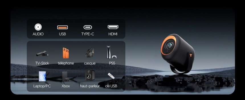 - ▶️ Mini projecteur avec clé TV : il suffit de le connecter à une clé TV et vous avez accès aux plateformes de streaming populaires telles que Netflix, Prime Video, YouTube et plus encore. Profitez d'une vaste bibliothèque avec plus de 500 000 films et séries. Ce mini vidéoprojecteur de 15 000 lumens avec technologie BT5.4 et WiFi 6 offre une expérience audiovisuelle vivante grâce à sa taille compacte et à ses images brillantes (clé TV non incluse).