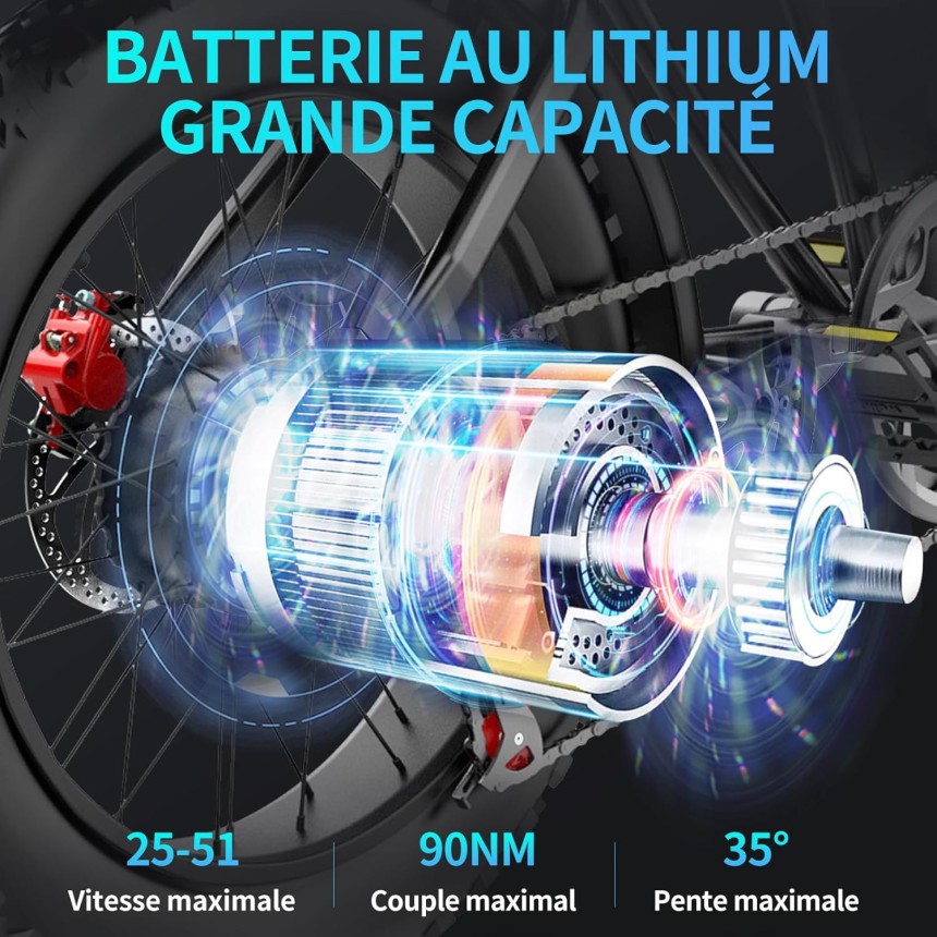 - ▶️ Moteur puissant : Le vélo électrique YVY C20 est équipé de puissants moteurs sans balais développant un couple maximal de 90 Nm, ce qui lui permet de gravir sans peine des pentes abruptes à 35° et vous permet d'explorer de nouveaux horizons en toute confiance.